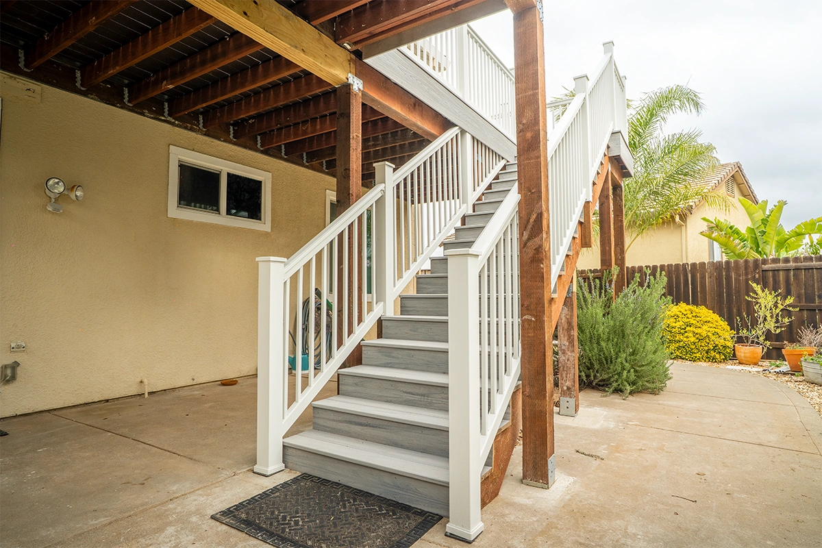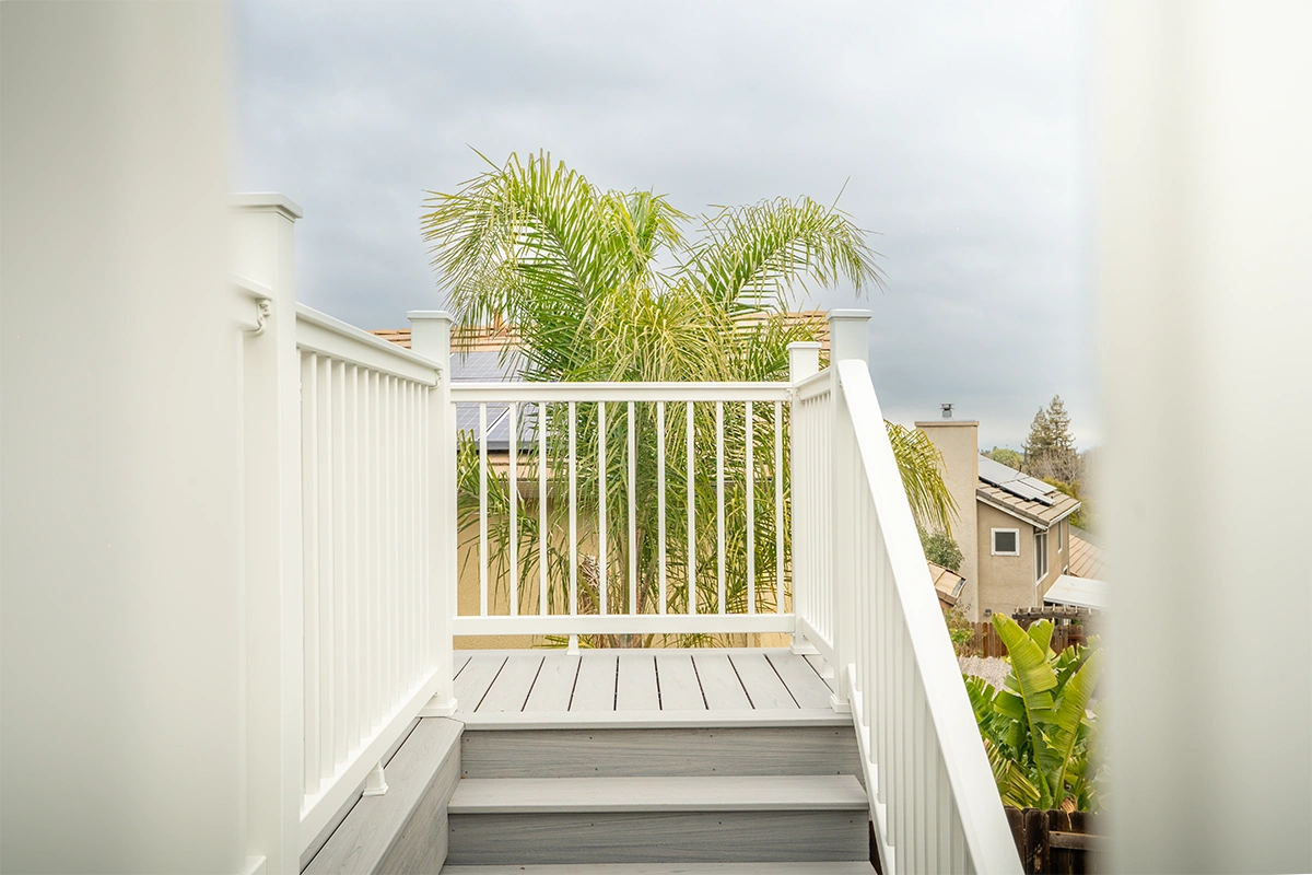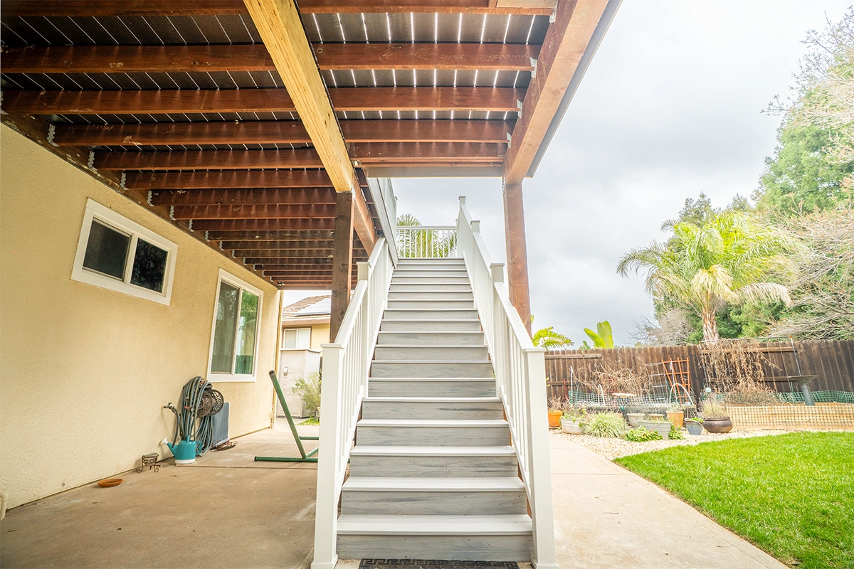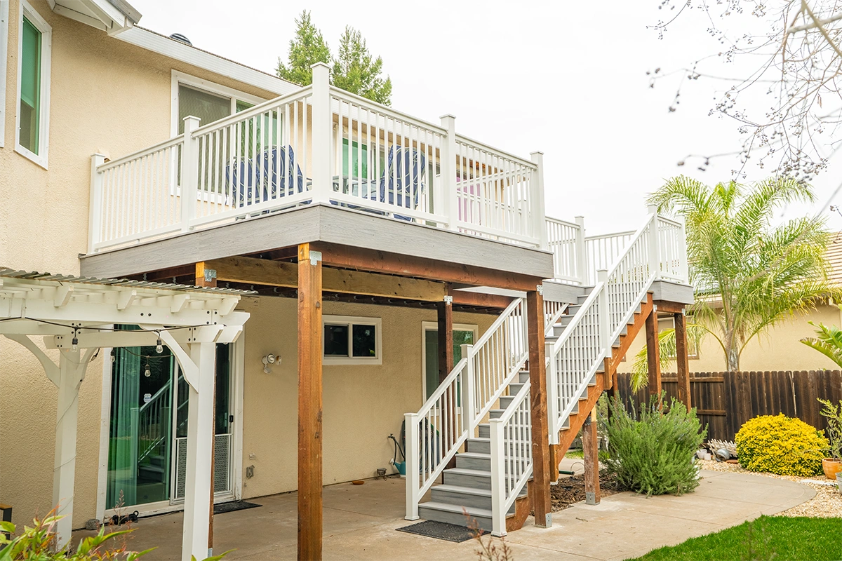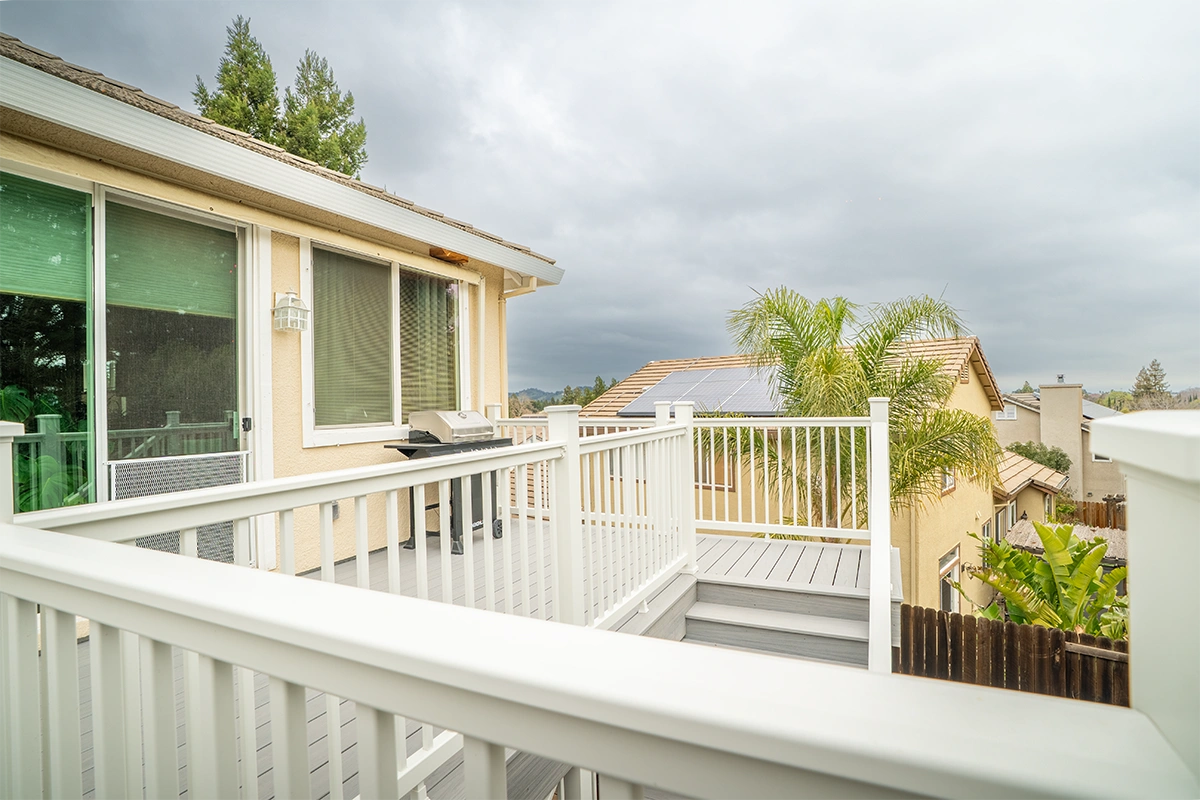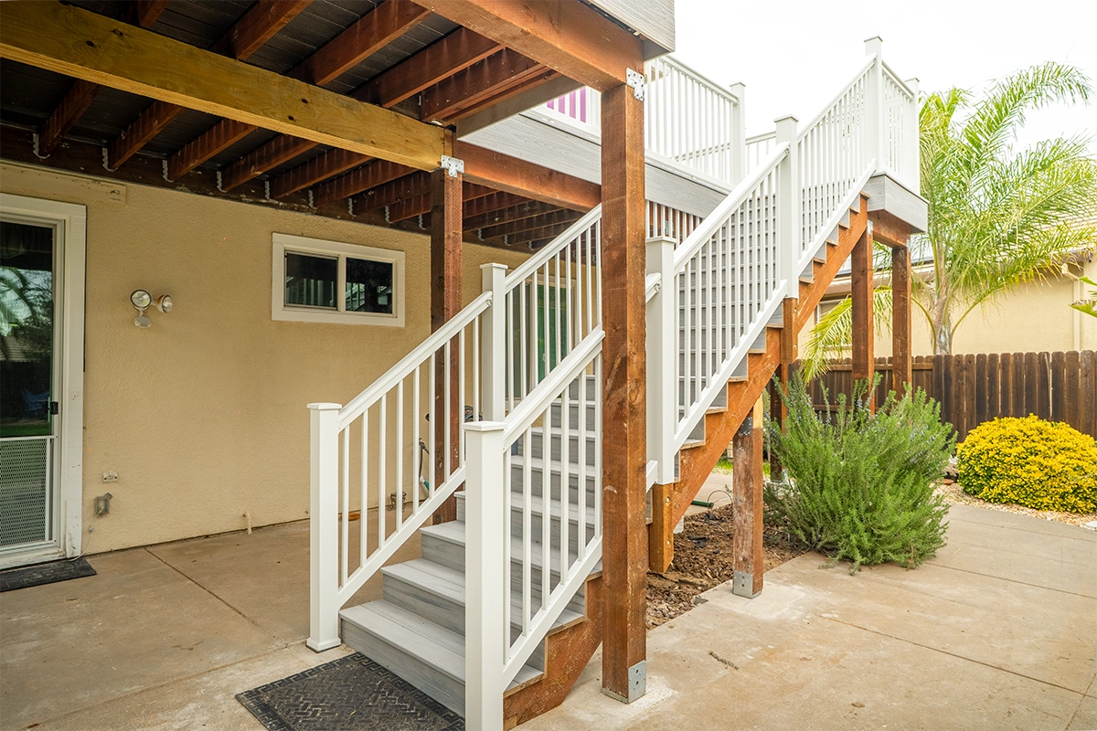 This deck rebuild and expansion project in Vacaville, CA included full demolition of the existing elevated deck system, structural framing replacement, a new Trex composite decking installation, Trex railing system, stair rebuild, engineered footing work, and concrete improvements. The project also included a 12’ x 12’ deck extension, new fascia, waterproofing details, and structural hardware upgrades to improve safety, durability, and long-term performance.