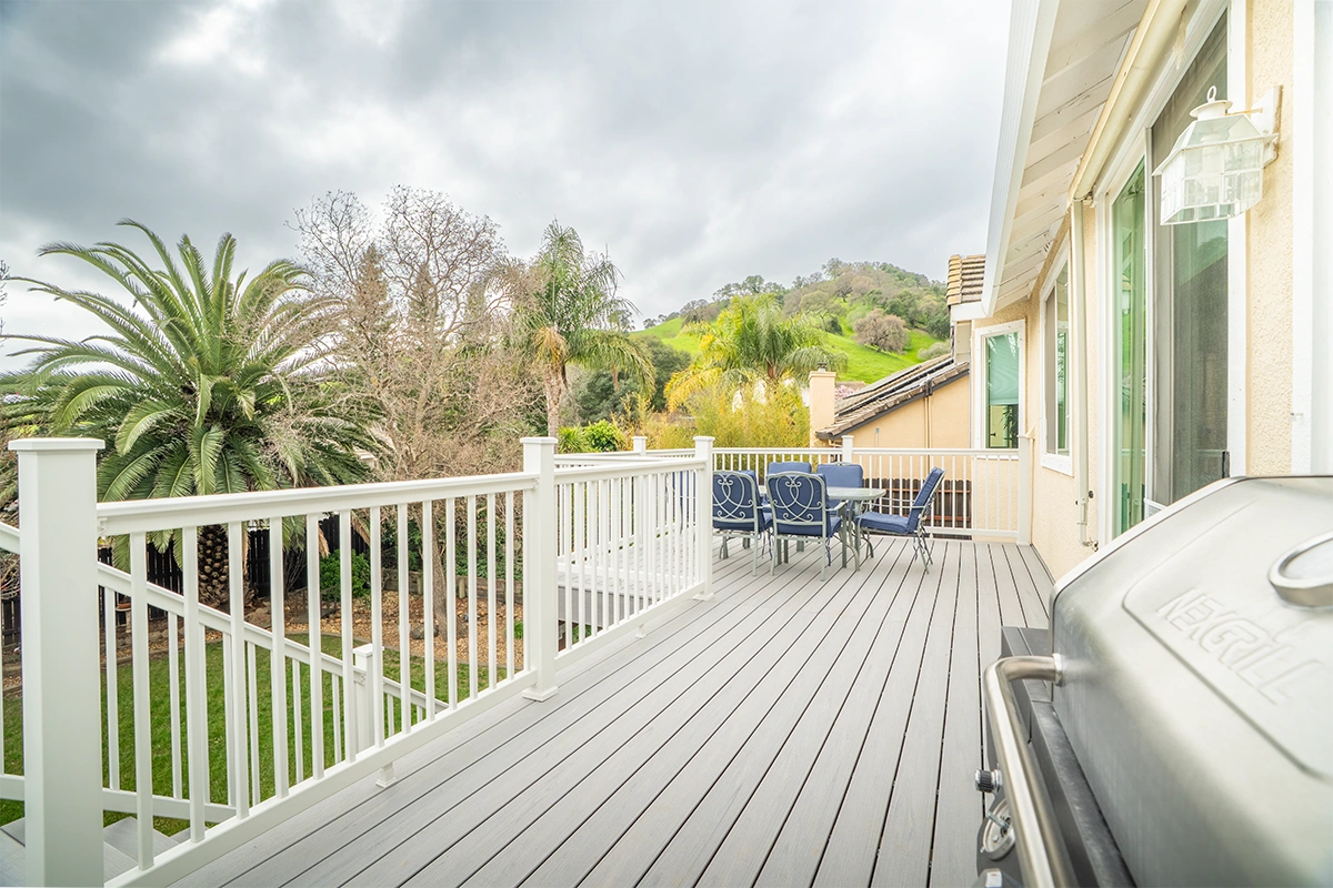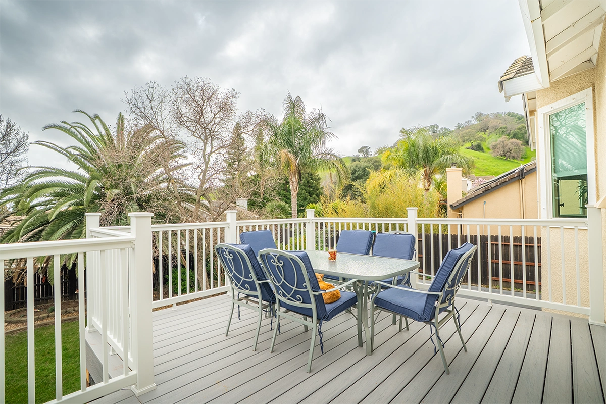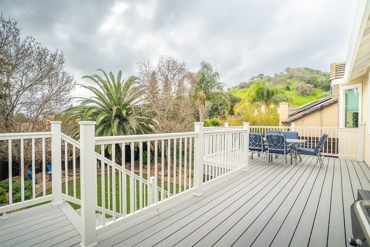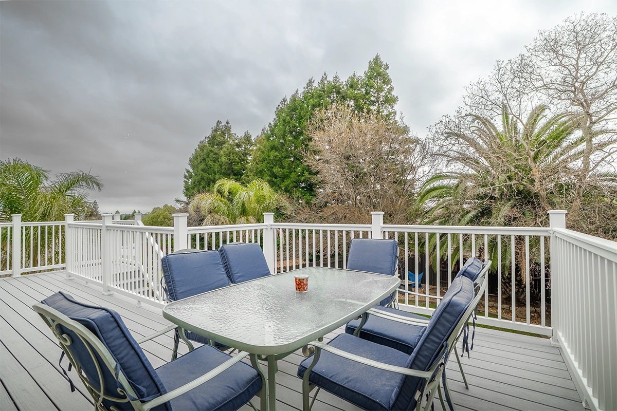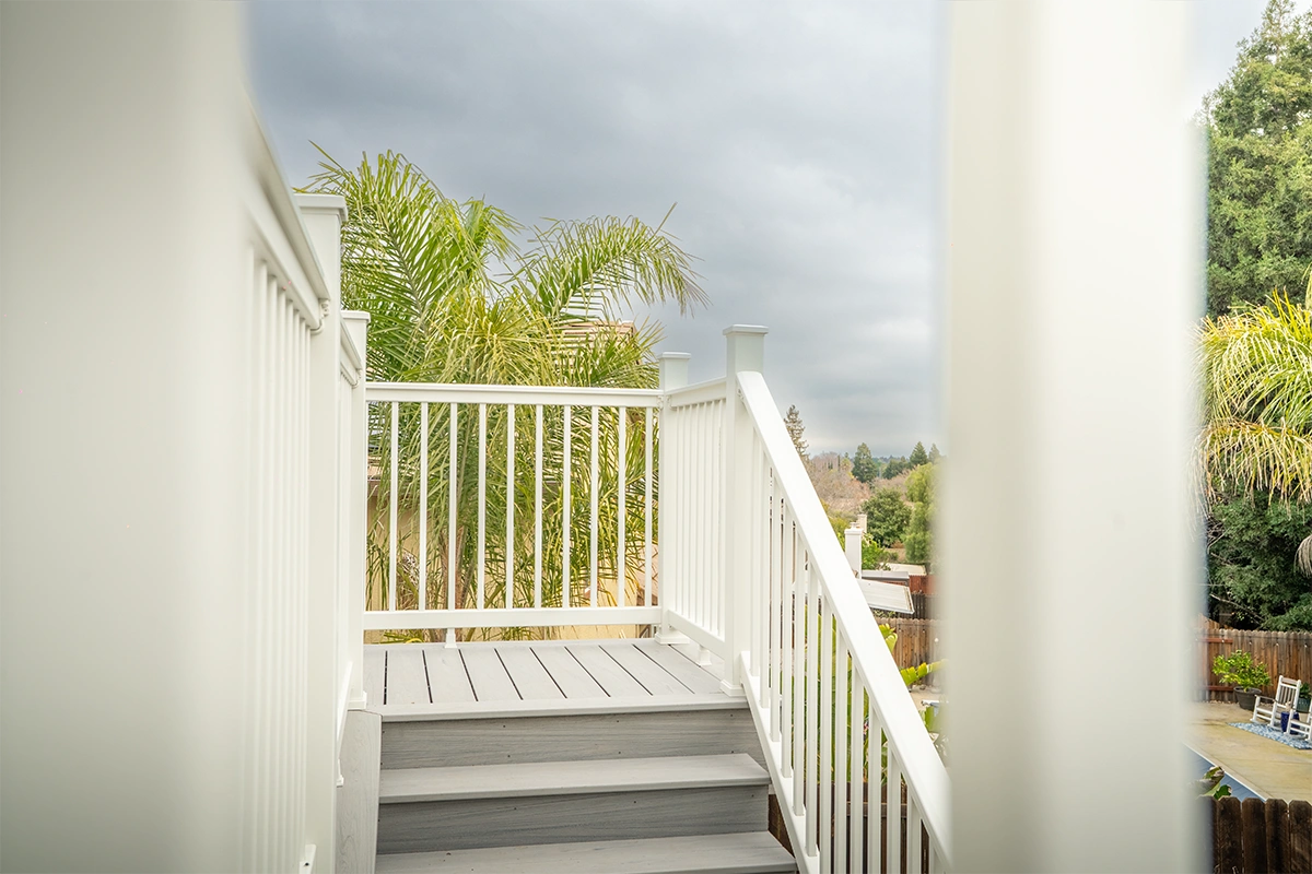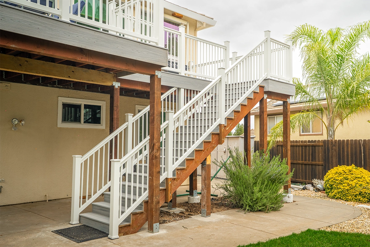 This deck rebuild and expansion project in Vacaville, CA included full demolition of the existing elevated deck system, structural framing replacement, a new Trex composite decking installation, Trex railing system, stair rebuild, engineered footing work, and concrete improvements. The project also included a 12’ x 12’ deck extension, new fascia, waterproofing details, and structural hardware upgrades to improve safety, durability, and long-term performance.