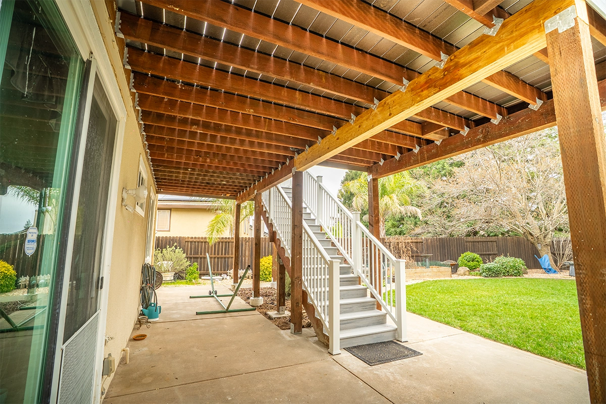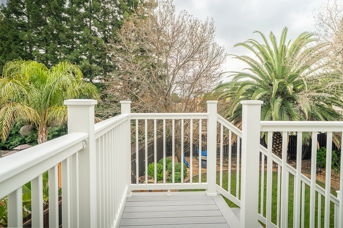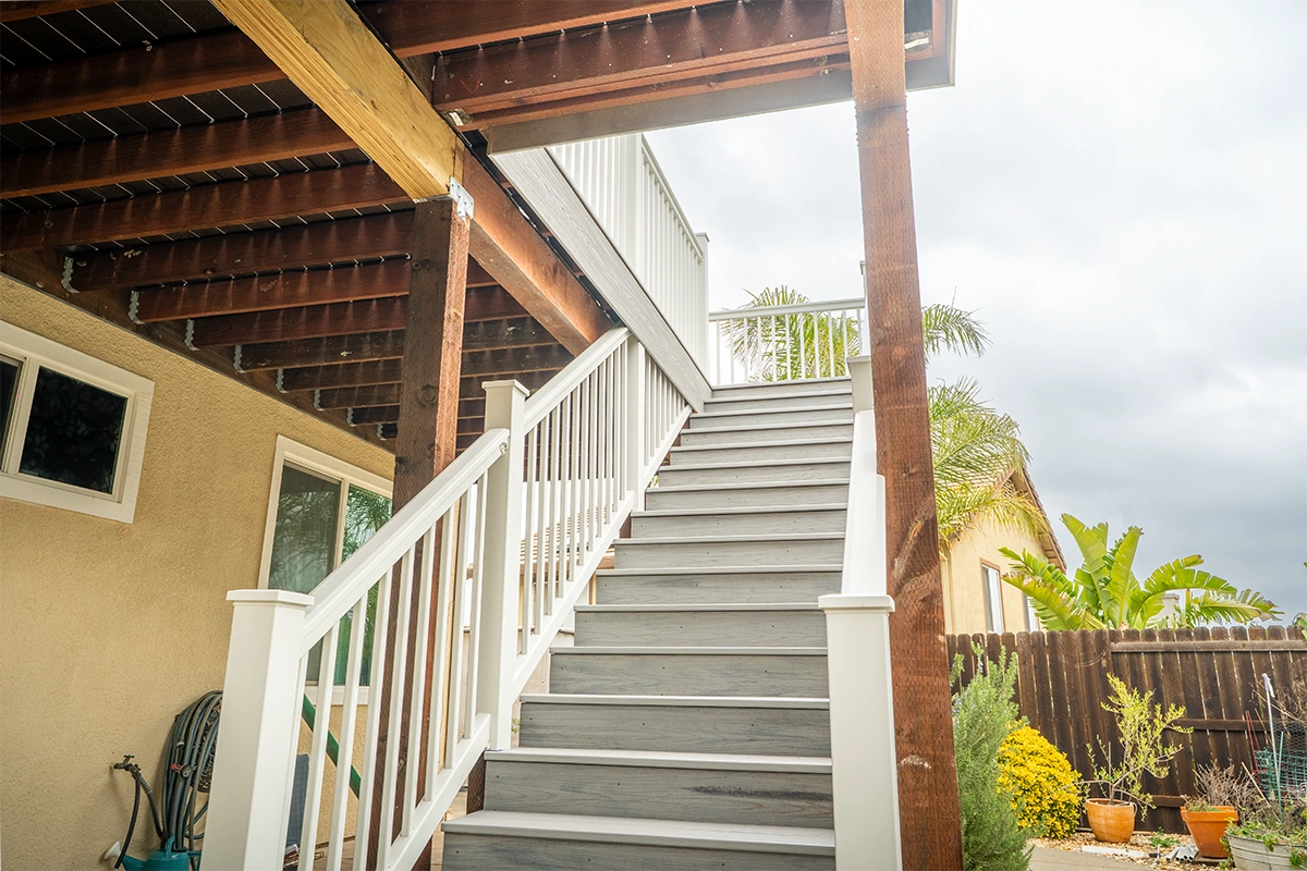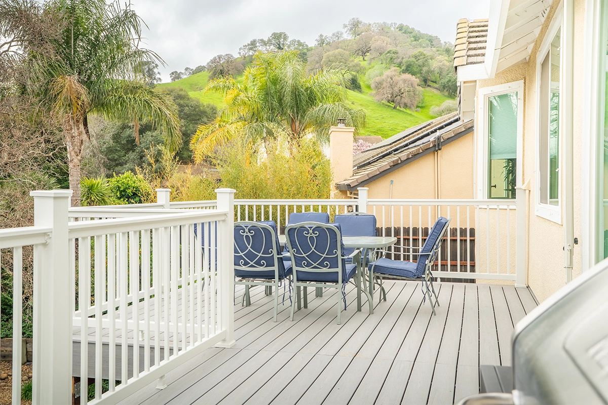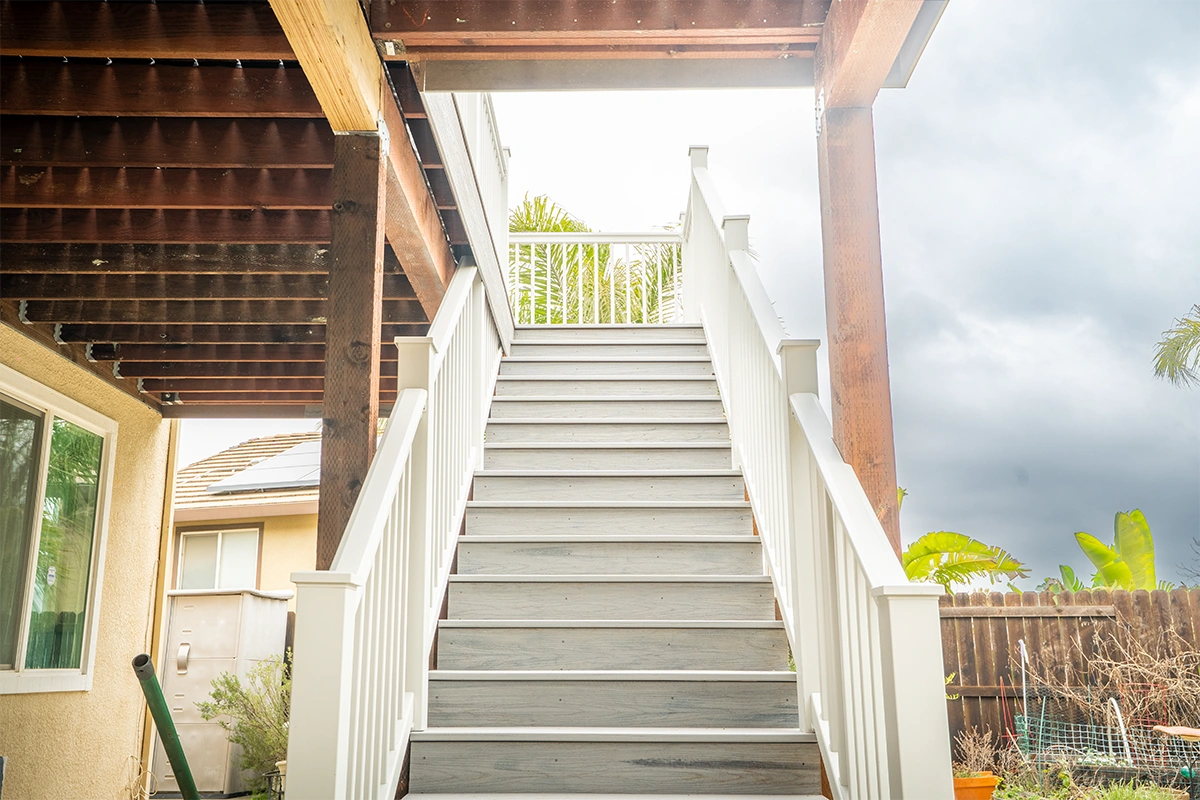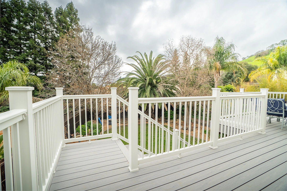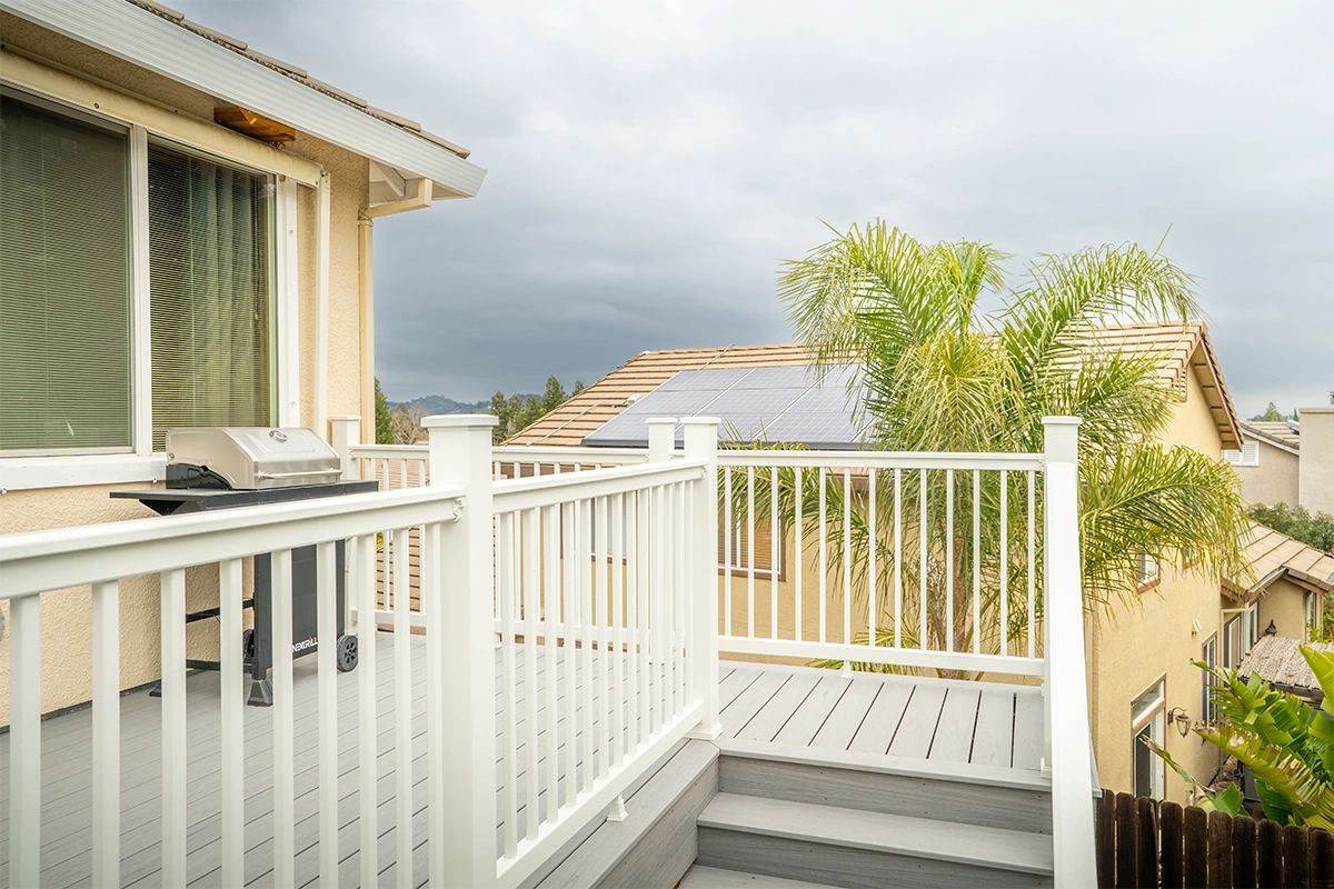This deck rebuild and expansion project in Vacaville, CA included full demolition of the existing elevated deck system, structural framing replacement, a new Trex composite decking installation, Trex railing system, stair rebuild, engineered footing work, and concrete improvements. The project also included a 12’ x 12’ deck extension, new fascia, waterproofing details, and structural hardware upgrades to improve safety, durability, and long-term performance.